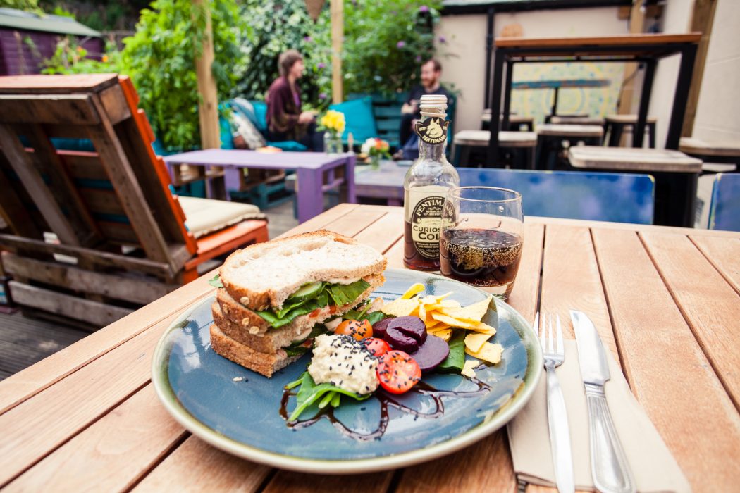 But first, I needed lunch and paid a visit to the first vegan cafe in Aberdeen – conveniently located around the corner of my hotel. Bonobo Cafe is a worker’s co-op and dishes up everything from light or hearty cooked breakfasts to wraps, sandwiches, stews, soups and several other mains and specials. I opted for a vegan “tuna” sandwich and enjoyed it in the tranquil atmosphere of the cafe’s green roof-top garden.