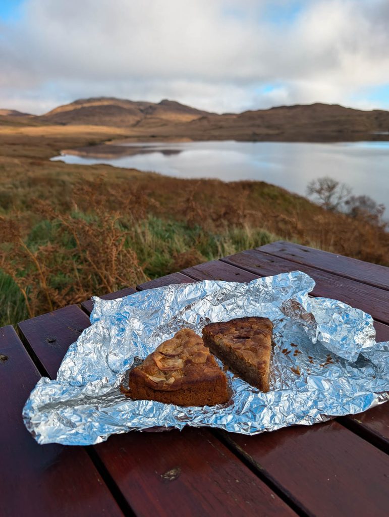 After our dip, we continued to Leacraithnaich Bothy, a small building that sits elevated above the loch. The bothy is managed by the Mountain Bothy Association and offers basic shelter to hill walkers and adventurous campers. There is no electricity or running water, just two large rooms with fireplaces, tables and sleeping platforms, and an additional small room for sleeping. The inside felt colder than outside, so we opted to sit out on a picnic bench and treat ourselves to some homemade apple cake.