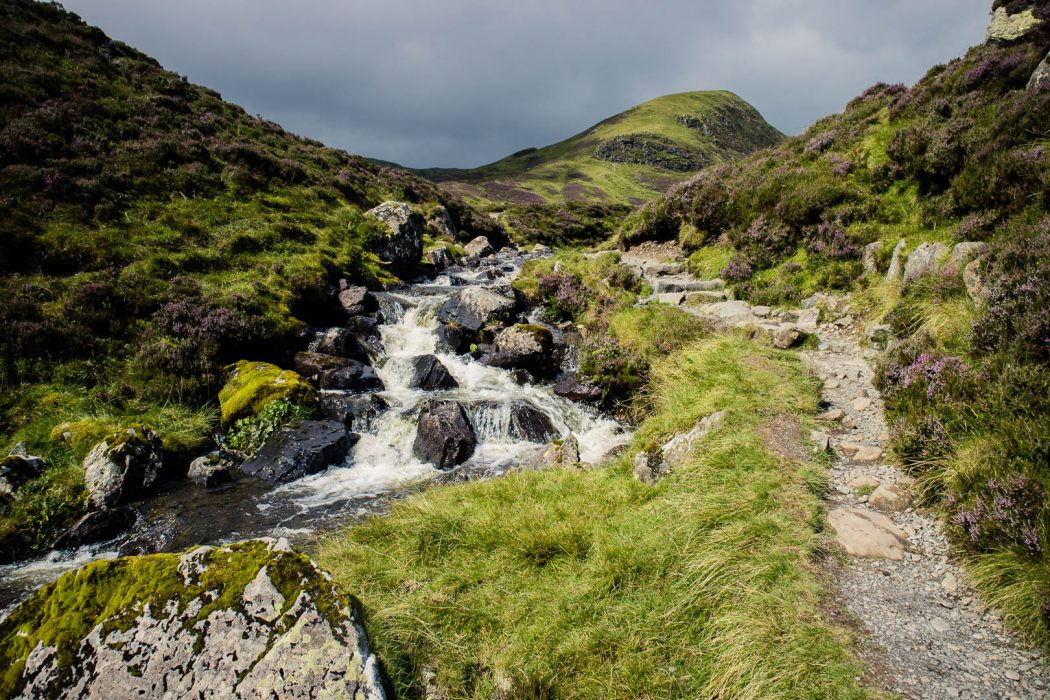 Once we passed the top of the waterfall, the trail evens out and we continued to stroll along the casually meandering river and a few smaller waterfalls. The wind had been picking up as we climbed higher, and sunshine and rain were taking turns by the minute – a typical Scottish day.