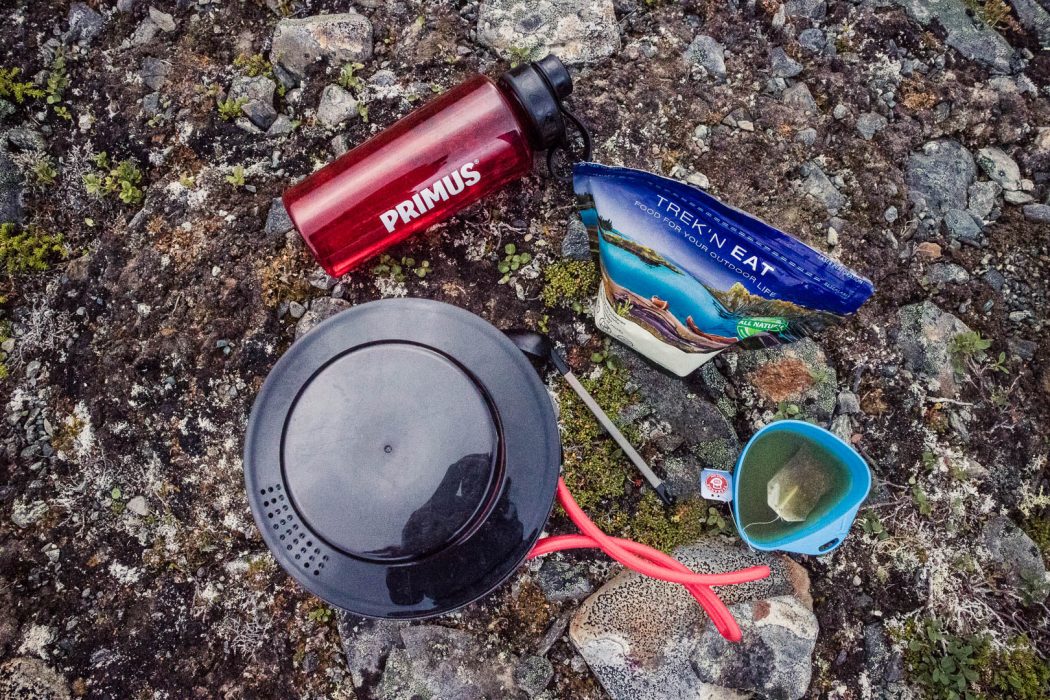 At the bottom of my backpack, I packed the things I only needed to take out in the evening – the tent, my sleeping system and my spare clothes. Further up came items like my freeze-dried meals, lunchbox and storage of snacks. Next, I packed my stove, storage of tea, toilet paper, a camera bag and a little bag of “warm clothes” (down jacket & gloves). I had the snacks I wanted to eat during the day on quick access in the top pocket of my backpack, as well as my toiletry/first aid bag, sun lotion, midge spray, spoon, whisky flask and paper for notes. These were the things I most likely needed even in short breaks.