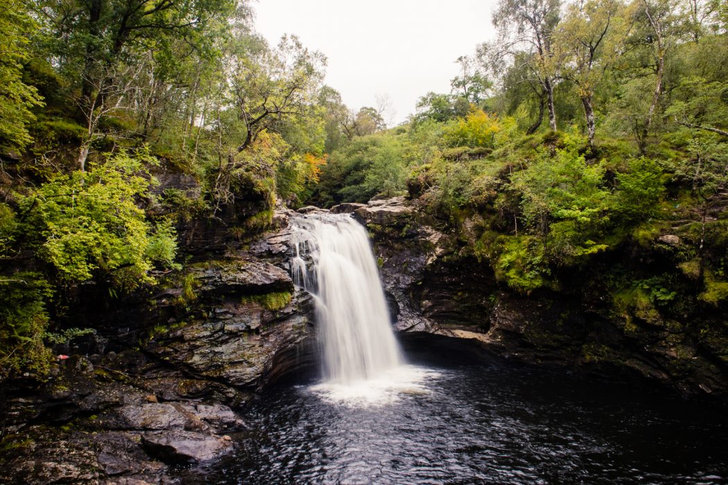 Falls of Falloch is a beautiful waterfall on the River Falloch, just north of Loch Lomond. It drops 10m in a single leap into a large pool surrounded by woodlands. It is a great stop for a quick leg stretcher and a few photos of the waterfall.