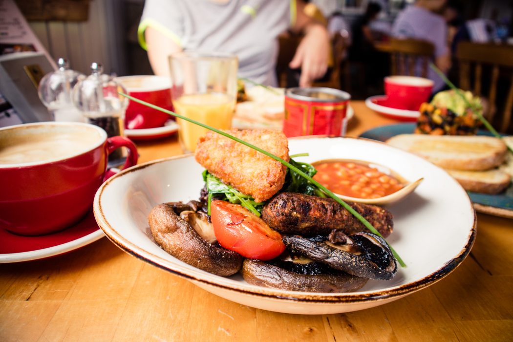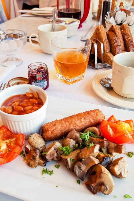 I was able to order porridge at every single of our B&Bs that offered breakfast and asked for it to be made with water, or soy milk if they had any. I don’t mind drinking my coffee black, but most places I was also able to get some soy milk for the table. At traditional B&Bs breakfast includes a plate of cooked food, and your vegan options are mushrooms, tomatoes and baked beans on toast – I’d ask for it to be prepared without butter as that is often the case. Veggie sausages were a rarity in my experience, but to be honest, I prefer a veg-heavy breakfast anyways.