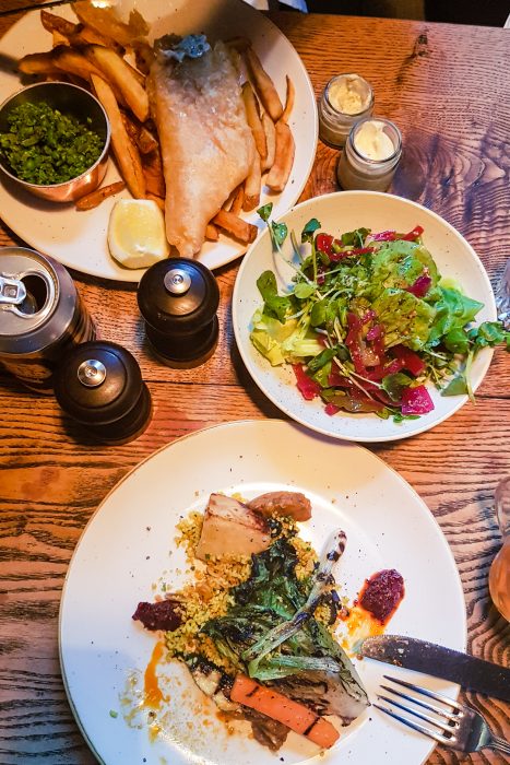 Craigellachie Hotel | Maybe the fanciest restaurant we ate at throughout our Speyside Way trip, was the Copper Dog gastropub at Craigellachie Hotel. I had looked up their menu online and was already excited about the promised cauliflower steak, only to find out that they had changed their seasonal menu in the meantime and the vegan option was a Moroccan tagine with couscous. Luckily, the tagine tasted great and the salad came with a refreshing dressing! The only downside of this restaurant for us was, that the portion sizes were rather small, but the prices were not… It’s worth treating yourself though, even if it was a rather easy day of walking here from Ballindalloch!
