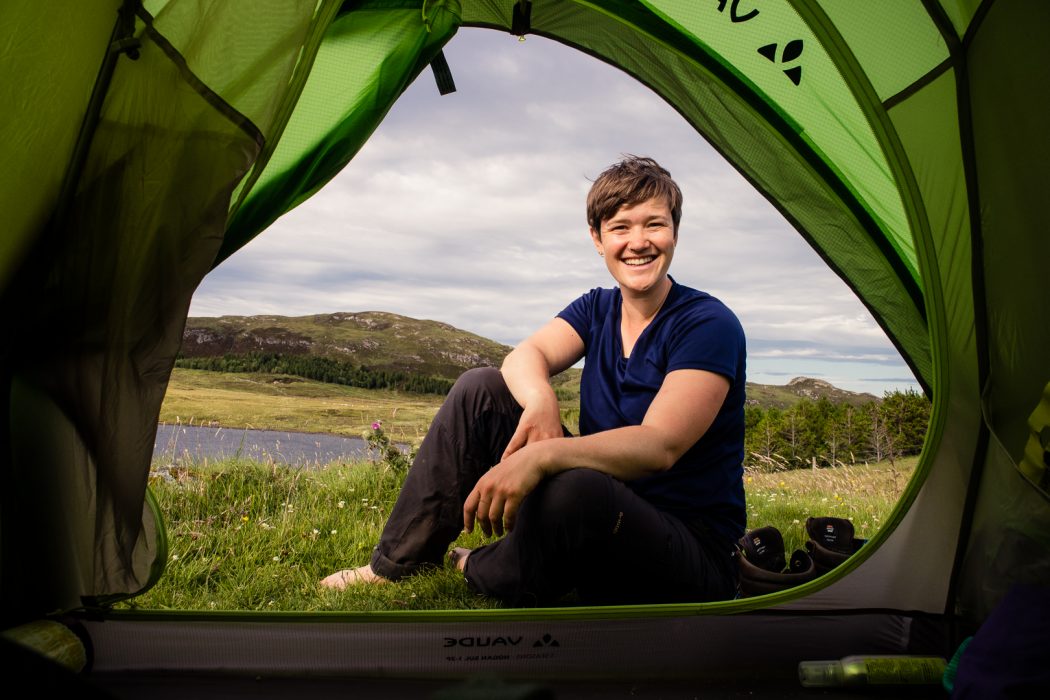 Travel writer and hiker Kathi Kamleitner outside her tent on the Hebridean Way in Scotland.