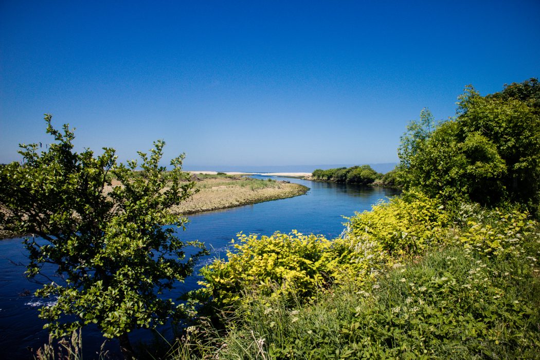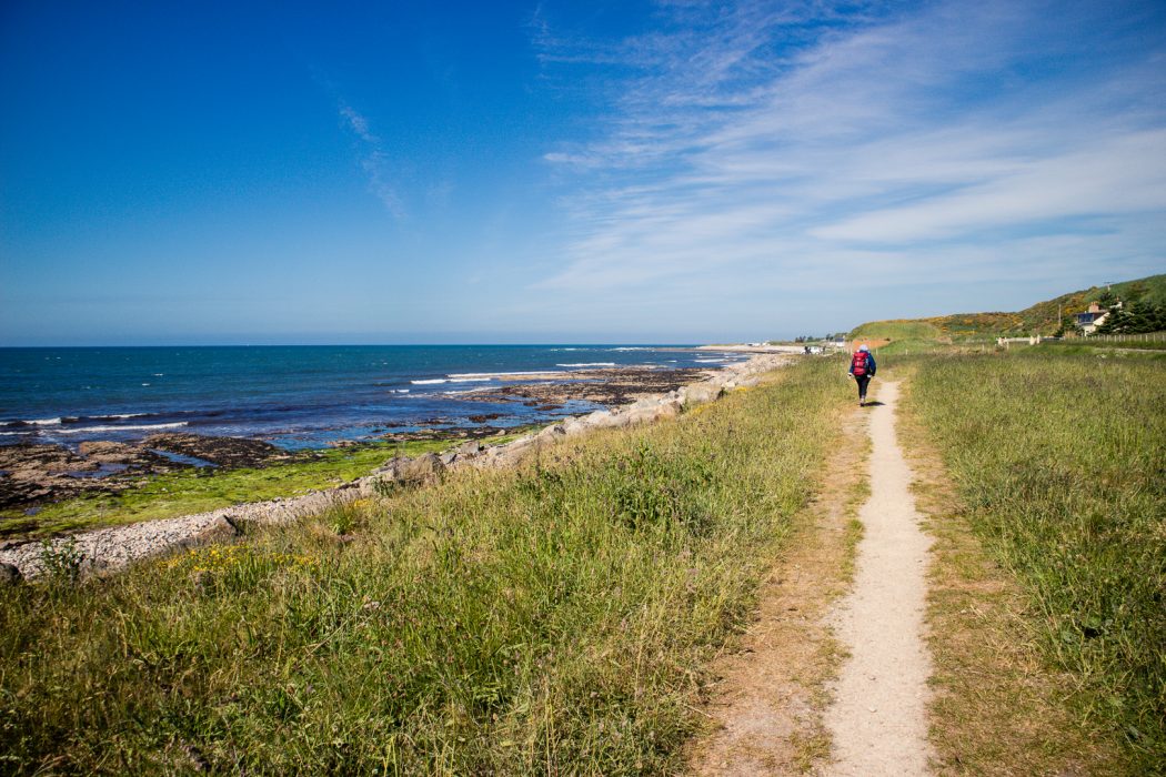 The first section runs very close to the river Spey, offering beautiful views on a regular basis, and across farmland. Having already spotted the sea yesterday from the top of Ben Aigan forest, we could feel how close we were to the sea now. The air had changed and the vegetation along the trail was different too. And after a couple of hours, we could see it again – the sea.