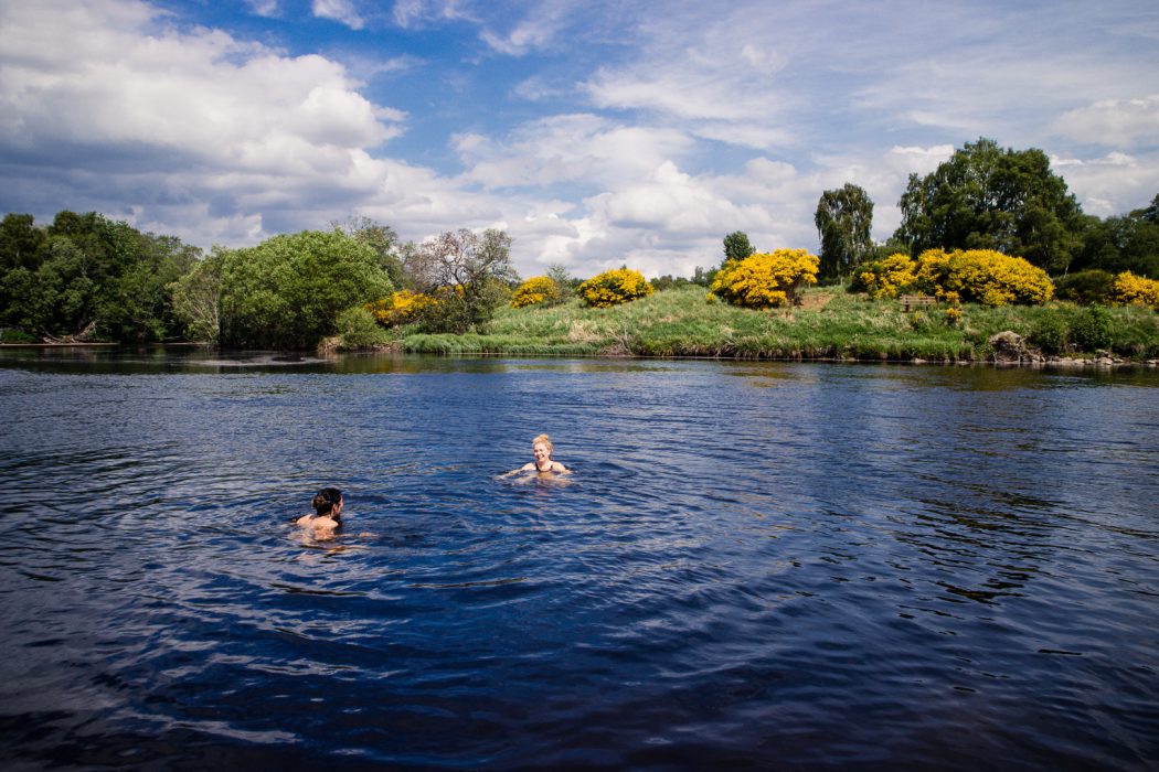 We took a dive in – brrr, it was cold – and took a long break in the sun to cool down. Rather than walking back to continue on the official Speyside Way, we followed another track along the river, which also led to Boat of Garten.