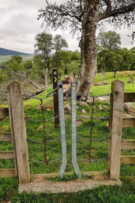The rest of today’s route is a section of squeeze-stile gates – we must have gone through at least 40 of them, sometimes three in a row, but who’s counting. The Speyside Way now leads mostly across farmland and through the woods, making for serene views and plenty of encounters with friendly farm animals.