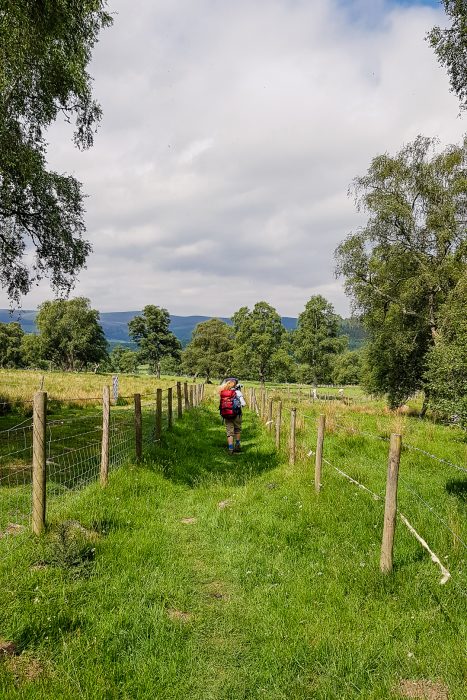 After lunch in Nethy Bridge, we continued towards Grantown on Spey. The majority of the trail runs along a long-disused railway line and sometimes across farmland. Today the railway line is still a novelty – it means the trail is conveniently wide and the ground fairly flat and easy to walk on.