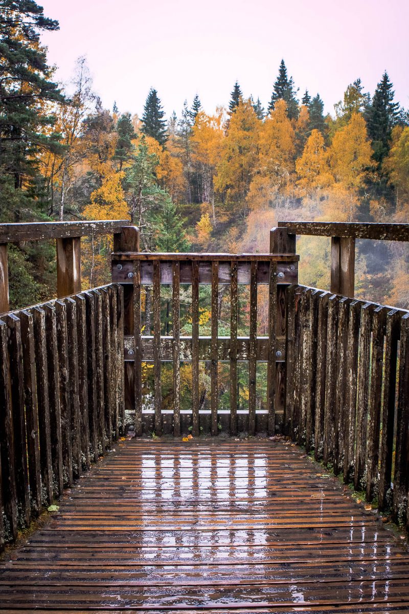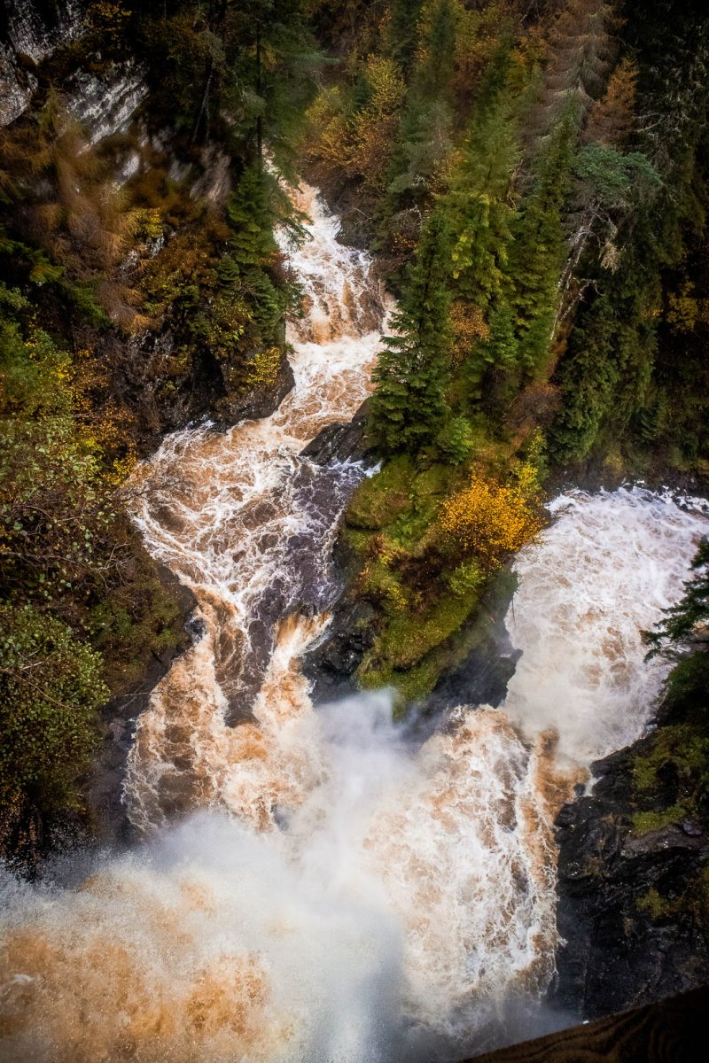 There are two viewing areas for the main falls, one near the level of the top, one further down. The woodland trails continue to the Lower Falls and a bit further upstream, near Cameron’s Tearoom, you can also visit the Upper Falls.