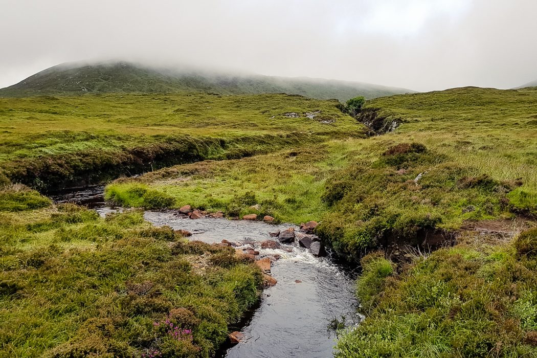 I found myself back on the road for a wee while, but soon returned to the empty moorland and the trail climbed almost to the top of Beinn Mhor – not that I could see much, as the clouds had finally won and I was getting wet from all sides (rain and bog – my favourite combination).