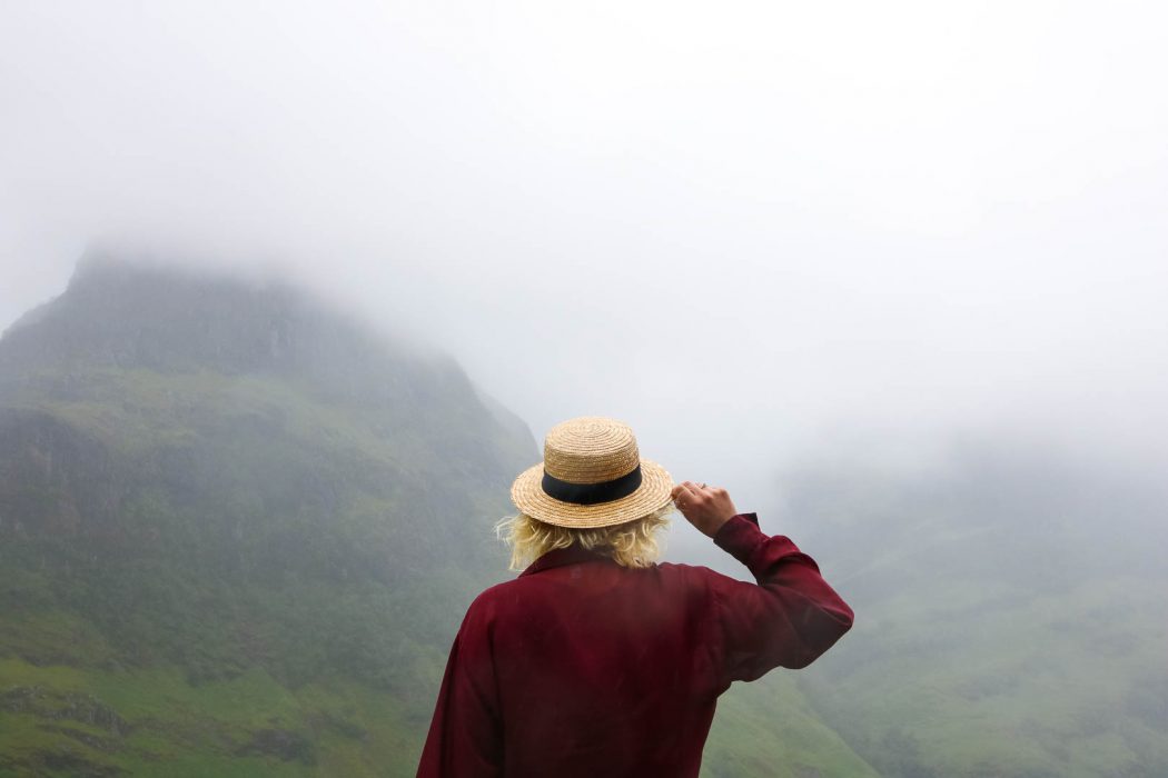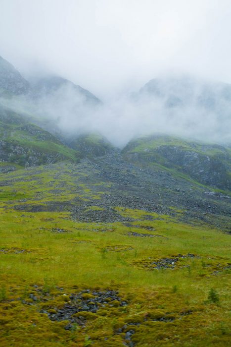 Our next stop was in Glencoe, undoubtedly one of Scotland’s most beautiful and most famous valleys – but actually, it was three stops in the area. First, we got the chance to take some photos of the sailing boats softly swaying on Loch Leven. We then passed right through the village and headed into the valley. Driving past the impressive mountain range of Aonach Eagach, we next halted at the Three Sisters car park. On a good day, they Glencoe valley lies at your feet here – but even in the fog, you could feel the grandness of this place.